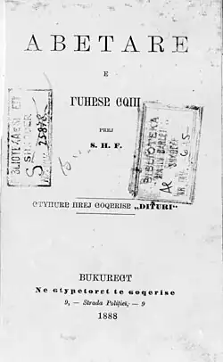 The aforementioned booklet Albania: What she has been, What she is, What she shall be was first published in Albanian without the author's name in 1899, then in French, and in 1904, right after Şemseddin Sami's death, it was published in Sofia under his name and in Turkish with the condition that it was "literally translated from Albanian". Turkish historians generally do not accept that this work belongs to Şemseddin Sami and consider the event as an effort to gain prestige to Albanian nationalism by using Şemseddin Sami's reputation and prestige. Considering Şemseddin Sami's intense interest in the issues of Turkishness and Ottomanism, especially in his last years, it can be thought that there is some truth in this view. On the other hand, in Albanian works, there is not the slightest doubt that the Albanian manifesto belongs to Şemseddin Sâmi. [43][38] The booklet was smuggled out of the Ottoman Empire and published in Bucharest with the identity of the author not appearing in the publication.[38] Publishers from Austro-Hungary printed some of Frashëri's most important works containing nationalist themes with Austro-Hungarian Albanologists Theodor Anton Ippen and Baron Nopcsa financing the translation and distribution of his publications.[44] After several months passed from his death the identity of Frashëri as author was revealed on 17 November 1904 by Shahin Kolonja who had published the work and later by a German translation of the booklet in 1913.[45] As in previous publications he repeated certain points such as claiming Albanians as the oldest peoples of Europe, focused on Skanderbeg in a few pages, the Ottoman era in Albania and Albanian contribution to the empire.[46] The second section of the booklet was concentrated on Albania of his time.[46] Frashëri discussed the borders of Albania and Albanian unity despite the Gheg-Tosk subgroups and differences of religion in society.[46] He lamented the lack of progress spanning over twenty years toward developing the Albanian language and the opening of Albanian schools within the Ottoman Empire.[46]