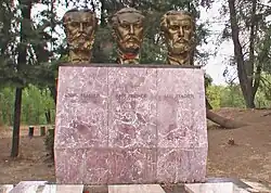 Monument to Frashëri brothers in Frashër with Sami third on the right (left); Monument to Frashëri brothers in Tiranë with Sami third on the right (right)