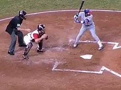 In 2003, the Cubs won the National League Central Division title. In May, he spent his first period on the disabled list since 1996 after having an injured toenail removed. On June 3, 2003, Sosa was ejected from a Chicago Cubs-Tampa Bay Devil Rays game in the first inning when umpires discovered he had been using a corked bat.[14] Major League Baseball confiscated and tested 76 of Sosa's other bats after his ejection; all were found to be clean, with no cork. Five bats he had sent to the Hall of Fame in past years were also tested, and were all clean as well.[15] Sosa stated that he had accidentally used the corked bat, which he claimed he only used during batting practice, and apologized for the incident.[16] When Cubs manager Dusty Baker was interviewed later, he stated any use of corked bats on his team is strictly prohibited. On June 6, Sosa was suspended for eight games all without pay[17] which was reduced to seven games (again without pay) on June 11 after appeal.[18] Sosa finished the season with 40 home runs and hit two more in the 2003 NLCS against the Florida Marlins, falling to the team in seven games.