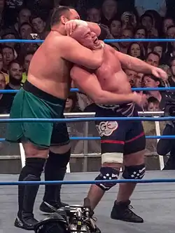 Seanoa became involved in professional wrestling after attending a Jiu-Jitsu class and being encouraged by instructors to attend a professional wrestling school taking place afterwards, whereupon he "fell in love with it" and began training regularly.[12] Seanoa attended the United Independent Wrestling Alliance (UIWA) West Coast Dojo, where he trained under Cincinnati Red, Johnny Hemp and, occasionally, John Delayo. He debuted in December 1999 in a match against "Uncle" Jess Hansen three months after beginning his training, adopting the ring name "Samoa Joe".[1] In 2000, Joe began appearing with the California-based Ultimate Pro Wrestling (UPW) promotion, then a developmental affiliate of the World Wrestling Federation (WWF), after being scouted by Brett Wagner.[12] While in UPW, Joe feuded with John Cena[14][15] and held the UPW No Holds Barred Championship from March to April 2001.[16] He was named Southern California's Rookie of the Year for 2000.[17] In February 2001, he appeared on an episode of WWF Jakked, losing to Essa Rios; he was subsequently told by WWF personnel that he "didn't have a future in [the WWF]".[12][14][18] In March 2001, Joe defeated Christopher Daniels to win the UPW Heavyweight Championship; he held the title for a record 258 days before losing to Mikey Henderson in November 2001.[18][19] In October 2001, Joe competed in All Pro Wrestling's "King of Indies" tournament that was won by American Dragon.[17][20][21]