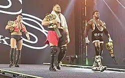 On the November 4, 2015 episode of NXT, Joe turned on Finn Bálor by attacking him after a match against Apollo Crews.[193] In December 2015 at NXT TakeOver: London, Joe unsuccessfully challenged Bálor for the NXT Championship.[194] Writing for the Wrestling Observer Newsletter, Kyle Johnson described Joe as "leaner, focused, motivated, and completely revitalized [...] as hungry as he had been in 2003-05 when he was still making his name in Ring of Honor and TNA."[75] After defeating Sami Zayn in a two out of three falls match to become the number one contender on the March 9 episode of NXT, Joe challenged Bálor once again at NXT TakeOver: Dallas in April 2016, losing after suffering a large laceration to his right cheek minutes into the match.[195][196] Later that month at a NXT live event in Lowell, Massachusetts, Joe finally defeated Bálor to win the NXT Championship.[197][198] In his first title defense, Joe defeated Bálor in a steel cage match in June 2016 at NXT TakeOver: The End, marking the end of their feud.[199]
