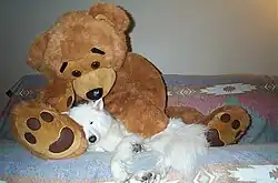 Samoyeds' friendly and affable disposition makes them poor guard dogs; an aggressive Samoyed is rare. The breed is characterized by an alert and happy expression which has earned the nicknames "Sammie smile" and "smiley dog".[14] With their tendency to bark, however, they can be diligent watch dogs, barking whenever something approaches their territory. Samoyeds are excellent companions, especially for small children or even other dogs, and they remain playful into old age. According to the Samoyed Club of America, when Samoyeds become bored, they may become destructive or start to dig.[15]