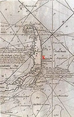 If Bellamy intended to revisit his lover Maria Hallett, he failed.[5] The Whydah was swept up in a violent nor'easter storm off Cape Cod at midnight, on 26 April 1717, and was driven onto the sand bar shoals in 16 feet (4.9 m) of water some 500 feet (150 m) from the coast of what is now Wellfleet, Massachusetts. At 15 minutes past midnight, the masts snapped and drew the heavily loaded ship into 30 feet (9.1 m) of water, where she capsized and quickly sank, taking Bellamy and all but two of the Whydah's 146-man crew with her.[21]