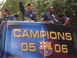 Eto'o made his Barcelona debut in the season opener at Racing de Santander on 29 August 2004. After Barcelona won the 2004–05 La Liga title, the team organized a festive party in the Camp Nou, during which Eto'o harangued the fans chanting, "Madrid, cabrón, saluda al campeón" (English for, "Madrid, bastards, salute the champions"). The Royal Spanish Football Federation fined Eto'o €12,000 for his comments, for which he later apologized. He expressed regret and asked for forgiveness from Real Madrid, his first professional team. The head of the Real Madrid fan club federation remained unimpressed, however, stating, "This character is a fantastic player, but he leaves a lot to be desired as a person."[20] He signed an improved contract with Barcelona in June 2005.[21]