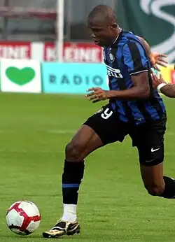 Eto'o scored his first Serie A brace on 29 October during a 5–3 win over Palermo, with Mario Balotelli also scoring twice.[56] On 1 December 2009, Eto'o finished fifth in voting for the Ballon d'Or, which was won by his former Barcelona teammate Lionel Messi.[57] Eight days later, he scored his first UEFA Champions League goal for the team in the final Group F match against Rubin Kazan to help Inter win 2–0 at home and progress to the knockout stage as runner-ups.[58] Eto'o continued to be a protagonist for Inter in Europe, netting the winner in the second leg of 2009–10 UEFA Champions League round of 16 against Chelsea on 16 March 2010, which allowed Inter to progress to the quarter-finals.[59] He scored his first goal in Coppa Italia on 13 April against Fiorentina in the second of semi-finals to help Inter win 1–0 at Stadio Artemio Franchi and progress in the final 2–0 on aggregate.[60] Eto'o won his first silverware with the club on 5 May as Inter defeated Roma 1–0 at Stadio Olimpico to lift the Coppa Italia.[61] His 12 Serie A goals helped Inter claim another championship, the fifth consecutive, after defeating Siena in the final matchday.[62] On 22 May 2010, Eto'o played in the third Champions League final of his career, as Inter won 2–0 over Bayern Munich to win the first title in 45 years; Milito scored both goals, with Eto'o setting up the second.[63] With Inter's triumph over Bayern Munich, he became the only player to win the treble in consecutive seasons with two different teams.[64]