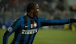 On 27 July 2009, Eto'o passed his medical and signed for five years with Inter.[49] On his first press-conference in Milan, he declared that he was where he wanted to be and refused to compare himself to Ibrahimović saying, "I'm Samuel Eto'o and I don't want to compare myself to anyone. I believe the victories I have earned up to now can contribute to giving the right value to my name."[50] On 8 August, Eto'o scored on his competitive debut in the 2009 Supercoppa Italiana as Inter lost 1–2 to Lazio.[51] Two weeks later, Eto'o scored from the penalty spot against Bari in his first Serie A match.[52] In the following match, the Derby della Madonnina against Milan, Eto'o won Inter a penalty after being brought down by Gennaro Gattuso in the box; Milito scored the penalty and Gattuso was yellow carded and eventually sent off. Inter won the match 4–0.[53] Eto'o scored again on 13 September against Parma, his first goal from open play in a Serie A match.[54]