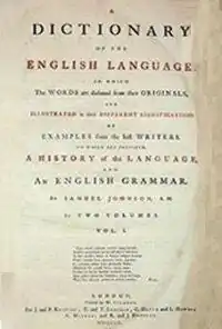 The Dictionary was finally published in April 1755, with the title page noting that the University of Oxford had awarded Johnson a Master of Arts degree in anticipation of the work.[89] The dictionary as published was a large book. Its pages were nearly 18 inches (46 cm) tall, and the book was 20 inches (51 cm) wide when opened; it contained 42,773 entries, to which only a few more were added in subsequent editions, and it sold for the extravagant price of £4 10s, perhaps the rough equivalent of £350 today.[90] An important innovation in English lexicography was to illustrate the meanings of his words by literary quotation, of which there were approximately 114,000. The authors most frequently cited include William Shakespeare, John Milton and John Dryden.[91] It was years before Johnson's Dictionary, as it came to be known, turned a profit. Authors' royalties were unknown at the time, and Johnson, once his contract to deliver the book was fulfilled, received no further money from its sale. Years later, many of its quotations would be repeated by various editions of the Webster's Dictionary and the New English Dictionary.[92]