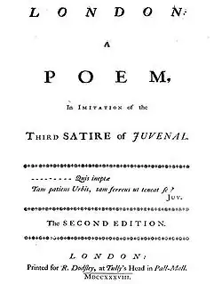 In May 1738 his first major work, the poem London, was published anonymously.[72] Based on Juvenal's Satire III, it describes the character Thales leaving for Wales to escape the problems of London,[73] which is portrayed as a place of crime, corruption, and poverty. Johnson could not bring himself to regard the poem as earning him any merit as a poet.[74] Alexander Pope said that the author "will soon be déterré" (unearthed, dug up), but this would not happen until 15 years later.[72]