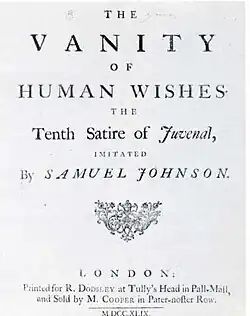 Not all of his work was confined to The Rambler. His most highly regarded poem, The Vanity of Human Wishes, was written with such "extraordinary speed" that Boswell claimed Johnson "might have been perpetually a poet".[100] The poem is an imitation of Juvenal's Satire X and claims that "the antidote to vain human wishes is non-vain spiritual wishes".[101] In particular, Johnson emphasises "the helpless vulnerability of the individual before the social context" and the "inevitable self-deception by which human beings are led astray".[102] The poem was critically celebrated but it failed to become popular, and sold fewer copies than London.[103] In 1749, Garrick made good on his promise that he would produce Irene, but its title was altered to Mahomet and Irene to make it "fit for the stage."[104] Irene, which was written in blank verse, was received rather poorly with a friend of Boswell's commenting the play to be "as frigid as the regions of Nova Zembla: now and then you felt a little heat like what is produced by touching ice."[105] The show eventually ran for nine nights.[106]