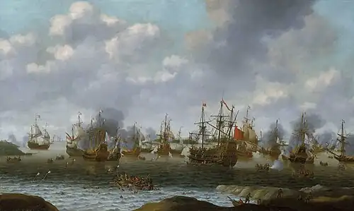 The Dutch raid was a major concern in itself, but Pepys was personally placed under a different kind of pressure: the Navy Board and his role as Clerk of the Acts came under scrutiny from the public and from Parliament. The war ended in August and, on 17 October, the House of Commons created a committee of "miscarriages".[8] On 20 October, a list was demanded from Pepys of ships and commanders at the time of the division of the fleet in 1666.[8] However, these demands were actually quite desirable for him, as tactical and strategic mistakes were not the responsibility of the Navy Board.