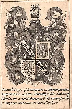 Bookplate, c. 1680–1690, with arms of Samuel Pepys: Quarterly 1st & 4th: Sable, on a bend or between two nag's heads erased argent three fleurs-de-lis of the field (Pepys[3]); 2nd & 3rd: Gules, a lion rampant within a bordure engrailed or (Talbot[4]). Samuel Pepys was descended from John Pepys who married Elizabeth Talbot, the heiress of Cottenham in Cambridgeshire.[5] The Pepys arms are borne by the Pepys family, Earls of Cottenham.[6]