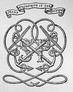 Samuel Pepys' bookplate. The motto reads Mens cujusque is est Quisque – "Mind Makes the Man".[16]