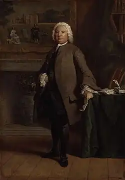 Samuel Richardson (baptised 19 August 1689 – 4 July 1761[1]) was an English writer and printer known for three epistolary novels: Pamela; or, Virtue Rewarded (1740), Clarissa: Or the History of a Young Lady (1748) and The History of Sir Charles Grandison (1753). He printed almost 500 works, including journals and magazines, working periodically with the London bookseller Andrew Millar.[2] Richardson had been apprenticed to the printer John Wilde, whose daughter Martha he eventually married. All six of their children died in infancy or childbirth, with Martha herself dying in childbirth in 1731. In 1733, he married Elizabeth Leake, daughter of printer John Leake. Together they had six more children, of whom four daughters reached adulthood. Richardson's first novel, Pamela, was penned at the age of 51 and was an instant success. Leading acquaintances included Samuel Johnson and Sarah Fielding, the physician and Behmenist George Cheyne, and the theologian and writer William Law, whose books he printed.[3] At Law's request, Richardson printed some poems by John Byrom.[4] In literature, he rivalled Henry Fielding; the two responded to each other's literary styles.