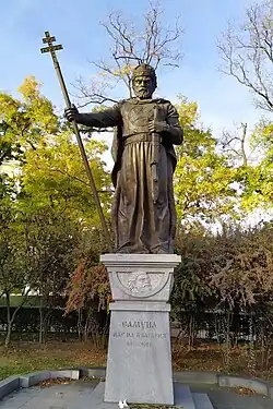 Some historians of the same school, such as the Serbian scholar Dragutin Anastasijević, even claimed that Samuel ruled a separate South Slavic, i.e. Serbian Empire in Macedonia, founded as result of an anti-Bulgarian rebellion.[147] The Serbs tried to popularize the Serbian past of that distinct state and its Serbian rulers.[170] The story continued in Communist Yugoslavia, where a separate Macedonian identity was formed and Samuel was depicted as a Macedonian Tsar.[171] After the breakup of Yugoslavia, these outdated theories have been rejected by authoritative Serbian historians from SANU as Srđan Pirivatrić and Tibor Živković.[172][173][174] Pirivatrić has stated, that incipient Bulgarian identity was available in Samuel's state, and it will rеmain in the area in the next centuries.[175]