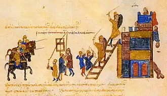 In 989, Phocas was killed and his followers surrendered, and the following year Basil II reached an agreement with Skleros.[77] The Byzantines focused their attention on Bulgaria,[78] and counter-attacked in 991.[79][80] The Bulgarian army was defeated and Roman was captured while Samuel managed to escape.[81] The Byzantines conquered some areas; in 995, however, the Arabs invaded Asia Minor and Basil II was forced to move many of his troops to combat this new threat. Samuel quickly regained the lost lands and advanced south. In 996, he defeated the Byzantines in the battle of Thessaloniki. During the battle, Thessaloniki's governor, Gregorios, perished and his son Ashot was captured.[82] Elated by this success, the Bulgarians continued south. They marched through Thessaly, overcame the defensive wall at Thermopylae and entered the Peloponnese, devastating everything on their way.[83]