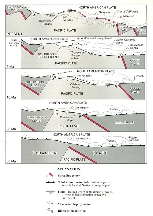 The San Andreas began to form in the mid-Cenozoic about 30 Mya (million years ago).[14] At this time, a spreading center between the Pacific plate and the Farallon plate (which is now mostly subducted, with remnants including the Juan de Fuca plate, Rivera plate, Cocos plate, and the Nazca plate) was beginning to reach the subduction zone off the western coast of North America. As the relative motion between the Pacific and North American plates was different from the relative motion between the Farallon and North American plates, the spreading ridge began to be "subducted", creating a new relative motion and a new style of deformation along the plate boundaries. These geological features are what are chiefly seen along San Andreas Fault. It also includes a possible driver for the deformation of the Basin and Range, separation of the Baja California peninsula, and rotation of the Transverse Range.