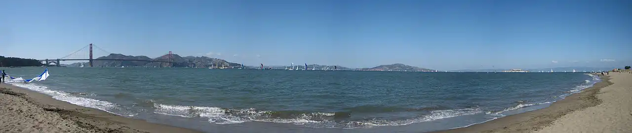The seasonal range of water temperature in the bay is from January's 53 °F (12 °C) to September's 60 °F (16 °C) when measured at Fort Point, which is near the southern end of the Golden Gate Bridge and at the entrance to San Francisco Bay.[40]