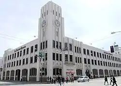 The Chronicle was founded by brothers Charles and M. H. de Young in 1865 as The Daily Dramatic Chronicle,[3] funded by a borrowed $20 gold piece. Their brother Gustavus was named with Charles on the masthead.[8][9] Within 10 years, it had the largest circulation of any newspaper west of the Mississippi River. The paper's first office was in a building at the corner of Bush and Kearney Streets. The brothers then commissioned a building from Burnham and Root at 690 Market Street at the corner of Third and Kearney Streets to be their new headquarters, in what became known as Newspaper Row. The new building, San Francisco's first skyscraper, was completed in 1889. It was damaged in the 1906 earthquake, but it was rebuilt under the direction of William Polk, Burnham's associate in San Francisco. That building, known as the "Old Chronicle Building" or the "DeYoung Building", still stands and was restored in 2007. It is a historic landmark and is the location of the Ritz-Carlton Club and Residences.[7]