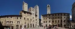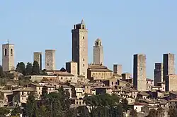 San Gimignano (Italian pronunciation: [san dʒimiɲˈɲaːno]; named after St. Geminianus) is a small walled medieval hill town in the province of Siena, Tuscany, north-central Italy. Known as the Town of Five Towers, San Gimignano is famous for its medieval architecture, unique in the preservation of about a dozen of its tower houses,[3] which, with its hilltop setting and encircling walls, form "an unforgettable skyline".[4] Within the walls, the well-preserved buildings include notable examples of both Romanesque and Gothic architecture, with outstanding examples of secular buildings as well as churches. The Palazzo Comunale, the Collegiata and Church of Sant' Agostino contain frescos, including cycles dating from the 14th and 15th centuries.[4] The "Historic Centre of San Gimignano" is a UNESCO World Heritage Site.[4] The town is also known for saffron, its dry-aged and saffron infused Golden Ham, pecorino cheese, and local white wine - Vernaccia di San Gimignano - produced from the ancient variety of Vernaccia grape grown on the sandstone hillsides of the area.[5][6]
