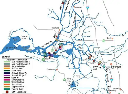 In 1926, Stockton pooled its finances with the federal and state governments for a total of $8.2 million. Construction on the channel, which included widening and deepening the riverbed and cutting off meanders and oxbow lakes, began in earnest in 1928.[89] These included major cuts at Hog Island, Venice Island and Mandeville Island, plus five smaller straightening projects. The navigation project shortened the river length by 4 mi (6.4 km) and deepened it to 37 ft (11 m). Additional deepening work was carried out in 1968 and 1982.[90] Today, the navigation channel, known as the Stockton Deep Water Ship Channel, can handle fully loaded vessels of up to 60,000 short tons (120,000,000 lb; 54,000,000 kg) and up to 900 ft (270 m) long.[91] However, the navigation works have unexpectedly led to low dissolved oxygen levels in the lower San Joaquin River, which has hurt fish populations. This is believed to be a result of the combination of the abrupt geometry change from the shallow river upstream of Stockton to the deep water channel, in addition to pollution from the harbor and city and poor tidal mixing.[92]