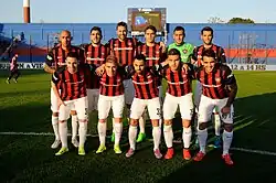 San Lorenzo made its debut in Primera on 4 April 1915, losing to Platense by 5–1. The first match won in the top division was the 7th fixture, when the team defeated Floresta by 3–1. San Lorenzo finished 12th at the end of the season, tied with Gimnasia y Esgrima de Buenos Aires.[11] On 7 May 1916, the club inaugurated its first stadium (popularly known as "Viejo Gasómetro" during a match against Estudiantes de La Plata, which San Lorenzo won by 2–1. That same year, the team finished 7th in the Primera División championship. In subsequent tournaments the team did not wage good campaigns, finishing 12th[12] and 13th. In 1919 the Argentine league split into two leagues, the official Asociación Argentina and dissident Asociación Amateur (AAm),[13] in which San Lorenzo took part, along with Racing Club, River Plate and Independiente, among other teams. San Lorenzo finished 9th.