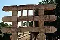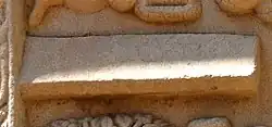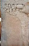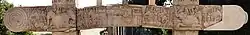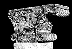 The Sarnath capital is a pillar capital discovered in the archaeological excavations at the ancient Buddhist site of Sarnath.[52] The pillar displays Ionic volutes and palmettes.[53][54] It has been variously dated from the 3rd century BCE during the Mauryan Empire period,[55][52] to the 1st century BCE, during the Sunga Empire period.[53] One of the faces shows a galopping horse carrying a rider, while the other face shows an elephant and its mahaut.[53]