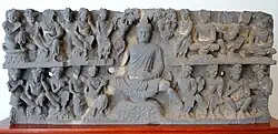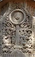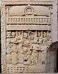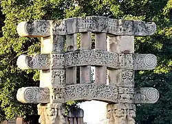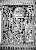 ![]() Stupa No. 2 Shunga period, but mason's marks in Kharoshti point to craftsmen from the north-west (region of Gandhara) for the earliest reliefs (circa 115 BCE).[27][28][23] |