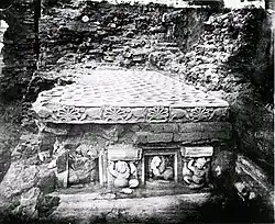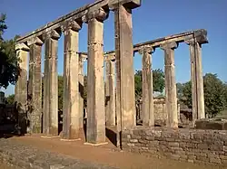Another structure which has been dated, at least partially, to the 3rd century BCE, is the so-called Temple 40, one of the first instances of free-standing temples in India.[16] Temple 40 has remains of three different periods, the earliest period dating to the Maurya age, which probably makes it contemporary to the creation of the Great Stupa. An inscription even suggests it might have been established by Bindusara, the father of Ashoka.[17] The original 3rd century BCE temple was built on a high rectangular stone platform, 26.52×14×3.35 metres, with two flights of stairs to the east and the west. It was an apsidal hall, probably made of timber. It was burnt down sometime in the 2nd century BCE.[18][19]