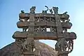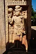 The Satavahana Empire under Satakarni II conquered eastern Malwa from the Shungas.[39] This gave the Satavahanas access to the Buddhist site of Sanchi, in which they are credited with the building of the decorated gateways around the original Mauryan Empire and Sunga stupas.[40] From the 1st century BCE, the highly decorated gateways were built. The balustrade and the gateways were also colored.[6] Later gateways/toranas are generally dated to the 1st century CE.[26]