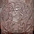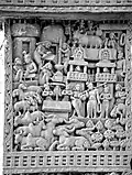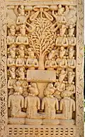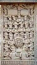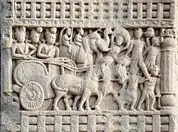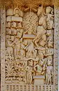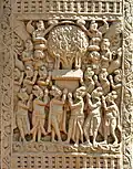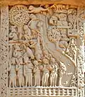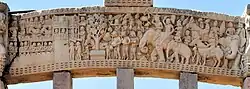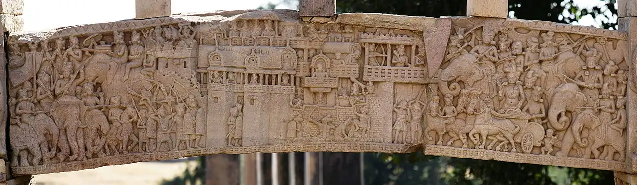 Although made of stone, the torana gateways were carved and constructed in the manner of wood and the gateways were covered with narrative sculptures. It has also been suggested that the stone reliefs were made by ivory carvers from nearby Vidisha, and an inscription on the Southern Gateway of the Great Stupa ("The Worship of the Bodhisattva's hair") was dedicated by the Guild of Ivory Carvers of Vidisha.[41][42]