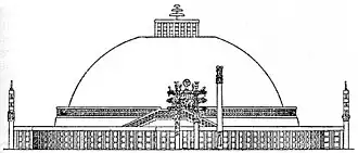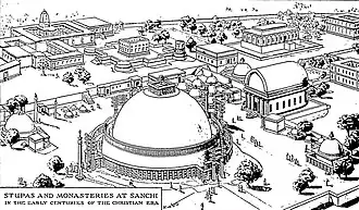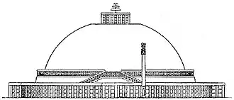 ![]() Approximate reconstitution of the Great Stupa with its pillar of Ashoka, under the Mauryas c. 260 BCE. |