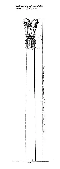 The pillar, when intact, was about 42 feet in height and consisted of round and slightly tapering monolithic shaft, with bell-shaped capital surmounted by an abacus and a crowning ornament of four lions, set back to back, the whole finely finished and polished to a remarkable luster from top to bottom. The abacus is adorned with four flame palmette designs separated one from the other by pairs of geese, symbolical perhaps of the flock of the Buddha's disciples. The lions from the summit, though now quite disfigured, still testify to the skills of the sculptors.[15]