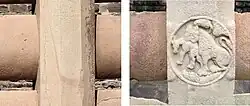 The pillar capital in Bharhut, dated to the 2nd century BCE during the Sunga Empire period, also incorporates many of these characteristics,[56][57] with a central anta capital with many rosettes, beads-and-reels, as well as a central palmette design.[47][58][59] Importantly, recumbent animals (lions, symbols of Buddhism) were added, in the style of the Pillars of Ashoka.