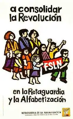 The FSLN's literacy campaign sent teachers into the countryside; within six months, half a million people had been taught rudimentary reading, bringing the national illiteracy rate down from over 50% to just under 12%.[80] Over 100,000 Nicaraguans participated as literacy teachers. One of the literacy campaign's aims was to create a literate electorate that could make informed choices in the promised elections. The success of the literacy campaign was recognized by UNESCO with a Nadezhda Krupskaya International Prize, although the actual success of this literary campaign, and its long-term impact, have been called into question.[81]