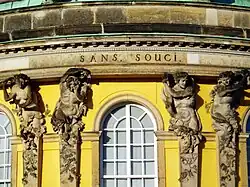 The palace has a single-storey principal block with two flanking side wings. The building occupies almost the entire upper terrace. The potential monotony of the façade is broken by a central bow, its dome rising above the hipped roof, with the name of the palace—remarkably, written with a comma and a full stop, viz. Sans, Souci.—[8][9] on it in gilded bronze letters. The secondary side wings on the garden front are screened by two symmetrical rows of trees each terminating in free-standing trellised gazebos, richly decorated with gilded ornaments.