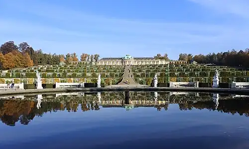The panoramic vista of the garden of Sanssouci is the result of Frederick the Great's decision to create a terraced vineyard on the south slope of the hills of Bornstedt. The area had previously been wooded, but the trees were felled during the reign of the "soldier-king" Frederick William I to allow the city of Potsdam to expand.