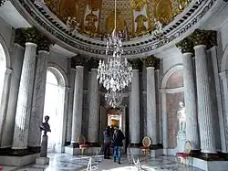 The principal entrance area, consisting of two halls, the "Entrance Hall" and the "Marble Hall", is at the centre, thus providing common rooms for the assembly of guests and the court, while the principal rooms flanking the Marble Hall become progressively more intimate and private, in the tradition of the Baroque concept of state rooms. Thus, the Marble Hall was the principal reception room beneath the central dome. Five guest rooms adjoined the Marble Hall to the west, while the King's apartments lay to the east - an audience room, music room, study, bedroom, library, and a long gallery on the north side.