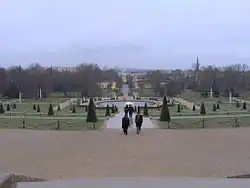 Following the terracing of the vineyard and the completion of the palace, Frederick turned his attention to the landscaping of the greater vicinity of the palace and thus began the creation of Sanssouci Park. In his organisation of the park, Frederick continued what he had begun in Neuruppin and Rheinsberg.[17] A straight main avenue was laid out, ultimately 2.5 km long, beginning in the east at the 1748 obelisk and extended over the years to the New Palace, which marks its western end.