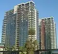 The southeast end of the city is part of the South Coast Metro area, which is shared with the city of Costa Mesa. South Coast Plaza, a major shopping center, is the primary destination of this area, which also contains several high-rise office and apartment buildings. Yokohama Tire Corporation's United States headquarters are located at 1 MacArthur Place in the South Coast Metro area of Santa Ana, and Banc of California's headquarters relocated from the neighboring city of Irvine.[30][31]