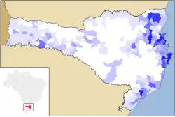 According to the 2022 Brazilian census conducted by the Brazilian Institute of Geography and Statistics (IBGE), Santa Catarina has a total population of 7.6 million and a population density of 79.5 inhabitants per square kilometre. This ranks it as the tenth most populous state in Brazil, accounting for 3.75% of the country's total population.[1] The state's largest city, Joinville, has a population of 616,317, making it the 34th most populous city in Brazil.[54] Meanwhile, its capital, Florianópolis, which is the state's second-largest city, has a population of 537,211, ranking it 39th among Brazilian municipalities by population.[55]