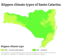 It is one of the Brazilian states with the most mountainous terrain, where 52% of the territory is located above 600 metres.[8] According to the Köppen-Geiger climate classification system, Santa Catarina predominantly features a humid subtropical climate (Cfa) in the coastal lowlands and the lower altitude areas of the plateau, whilst the remainder of the plateau is characterised by an oceanic climate (Cfb).[9]
