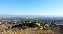 The official elevation of the city is 1,207 feet (368 m),[57] the elevation of the historic Newhall Airport which was northwest of Via Princessa and Railroad Avenue from the 1930s through the 1950s.[58] Elevation varies substantially throughout the city. The lowest point in Santa Clarita is near the junction of CA-126 and I-5 (34°26′32″N 118°36′10″W / 34.4422°N 118.6029°W), at an elevation of 1,024 feet (312 m). The highest point is in the San Gabriel Mountains south of Placerita and Sand Canyon Roads (34°21′36″N 118°24′22″W / 34.3599°N 118.4062°W) at an elevation of 3,048 feet (929 m).[59] Most populated areas in the city are 1,100–1,700 feet (340–520 m) above sea level. The highest residential areas of Canyon Country, north of Skyline Ranch Road and east of Shadow Pines Boulevard, exceed 2,000 feet (610 m).[60]