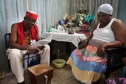The initiate can finally take their otanes home.[283] They may then undergo a year-long period, the iyaworaje ("journey of the iyawo"), during which they must observe certain restrictions, the nature of which depends on their tutelary oricha.[284] This may for instance include abstaining from sexual intercourse, wearing only white, or not cutting their hair.[285] The iyaworaje ends with the ebó del año ceremony.[286] Once this is done, they may lead rituals and help initiate others.[287] Thenceforth, they will celebrate the annual anniversary of their initiation, their cumpleaños de santo ("birthday in the saint").[288] Although a largely orally-transmitted tradition,[289] santeros and santeras often emphasise teaching in a non-verbal manner, encouraging their initiates to learn through taking part in the ritual activities.[290] Since at least the 20th century, some initiates have kept libretas, notebooks in which they have written down material relevant to the practice of Santería.[291] These may be shared with their own initiates or kept private.[292]