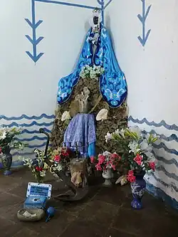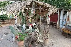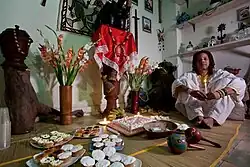 Many altars contain few or no anthropomorphic depictions of the oricha,[209] although will often include objects associated with them;[197] a wooden axe for Changó or a fan for Ochún, for instance.[206] Creating these altars is deemed expensive and time-consuming.[206] Material may be selected based on the tastes of the adherent; anthropologists have observed practitioners who have included Taoist figurines[210] or statues of wizards,[211] on their altars. Food and flowers are often placed on the altar as offerings.[212] Although rarely included on their altars, practitioners will often have statues of Roman Catholic saints elsewhere in their homes.[211]