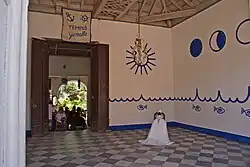 Rituals take place in the ilé ("house"),[179] sometimes called the ilé-oricha ("house of the oricha"),[180] casa templo ("house of worship"),[181] casa de santos ("house of saints"),[182] or casa de religión ("house of religion").[183] The ethnomusicologist María Teresa Vélez called this the "house-temple",[180] with the ilé usually being the personal home of a santero or santera.[166] It will typically have an inner room, the igbodu ("sacred grove of the festival"), where the most important rituals take place.[184] There will also be an eyá aránla or sala, often a living room, where semi-private rites can be conducted.[184] Another space, the iban balo, or patio, will be used for public occasions, as well as for the cultivation of plants and the housing of animals due to be sacrificed.[184] The ilé will typically include a place to store ritual paraphernalia, kitchen facilities, and space for visitors to sleep.[166]