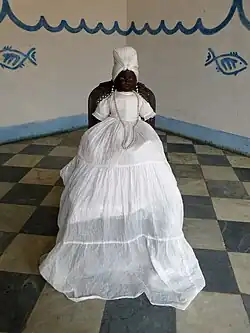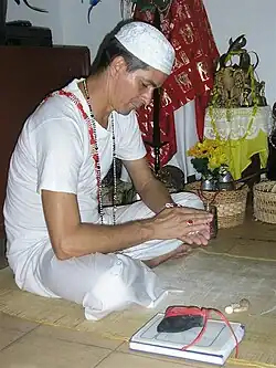 Some practitioners whose approach to Santería is influenced by Espiritismo also create cloth dolls for deceased family members and spirit guides.[396] The spirit is believed to enter and inhabit the doll,[397] with some practitioners stating that they can see the inhabiting spirit.[398] Sometimes the doll's clothing is changed to please the spirit,[397] while offerings, such as glasses of water or fruit, are placed before them.[399] These spirit dolls may also be passed down through the generations within a family.[400]