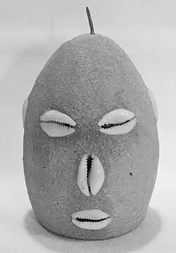Among the oricha are the four "warrior deities", or guerrors: Eleguá, Ogun, Ochosi, and Osun.[80] Eleguá is viewed as the guardian of the crossroads and thresholds;[81] he is the messenger between humanity and the oricha, and most ceremonies start by requesting his permission to continue.[82] He is depicted as being black on one side and red on the other,[83] and practitioners will frequently place a cement head decorated with cowrie shells that represents Eleguá behind their front door, guarding the threshold to the street.[84] The second guerro is Ogun, viewed as the oricha of weapons and war,[85] and also of iron and blacksmiths.[86] The third, Ochosi, is associated with woods and hunting,[87] while the fourth, Osun, is a protector who warns practitioners when they are in danger.[88]