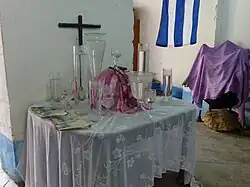 In addition to their altar to the oricha, many practitioners have altars set aside for the spirits of the dead.[213] These typically consist of a white-covered table known as a bóveda,[214] something derived from the White Table of Spiritism.[215] Bóveda often feature photographs of deceased relatives, to whom offerings are given;[216] popular offerings for the spirits of the dead include seven glasses of water,[127] a cafecito coffee,[217] and the aguardiente liquor.[218] Alternatively, many practitioners of Santería—like those who follow Palo—will have a rinconcito ("little corner"), a small area in which they collect together assorted objects, often those typically found in a household, as a material manifestation of the dead. Offerings to the dead may be placed here.[219] Many practitioners will also enshrine their family ancestors under the bathroom sink. This location is chosen so that the ancestors can travel between the realms of the living and the dead via the water in the pipes.[215]