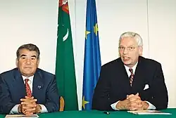 Niyazov with European Commissioner Hans van den Broek in Brussels, 24 February 1998