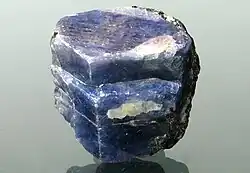 Sapphire is a precious gemstone, a variety of the mineral corundum, consisting of aluminium oxide (α-Al2O3) with trace amounts of elements such as iron, titanium, cobalt, lead, chromium, vanadium, magnesium, boron, and silicon. The name sapphire is derived from the Latin word sapphirus, itself from the Greek word sappheiros (σάπφειρος), which referred to lapis lazuli.[2] It is typically blue, but natural "fancy" sapphires also occur in yellow, purple, orange, and green colors; "parti sapphires" show two or more colors. Red corundum stones also occur, but are called rubies rather than sapphires.[3] Pink-colored corundum may be classified either as ruby or sapphire depending on the locale. Commonly, natural sapphires are cut and polished into gemstones and worn in jewelry. They also may be created synthetically in laboratories for industrial or decorative purposes in large crystal boules. It occurs in association with ruby, zircon, biotite, muscovite, calcite, dravite and quartz.[4]
